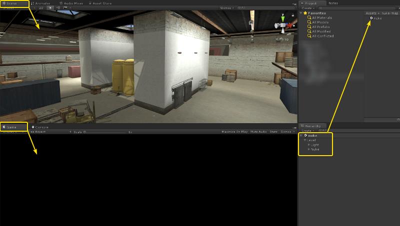 Ok, now after instanced the MFPS objects, you will see in the Game View that there is a camera showing the map from the sky; that's the camera that shows when a player enters the room, so adjust the position of it as you please in a location where the camera has a good view of the map.