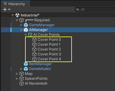 To streamline this process, the AIManager object already includes a set of default AI Cover Points. You can easily locate them within the Unity editor by navigating to AIManager ➔ * in the hierarchy window. From there, you have the flexibility to fine-tune the positions or add more cover points to enhance the bots' ability to made tactical decisions while seeking cover.