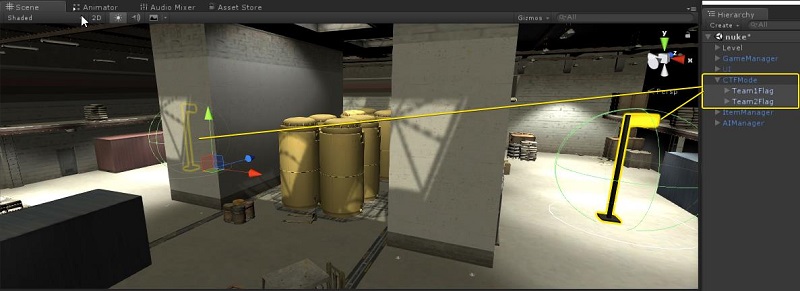 Some objects in your map may need to be repositioned, for exampl, the two flags used in the CTF game mode. You can find them under ┏━━━ Required > GameModes > CaptureOfFlag > Content > * in the hierarchy window. These flags should be placed in strategic locations near each team's spawn area to ensure balanced and competitive gameplay. Select and move them to the desired positions in your map accordingly.