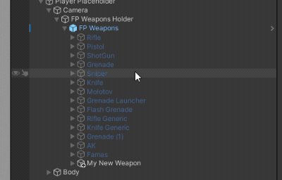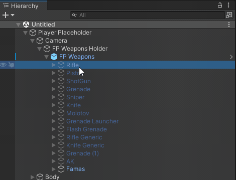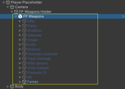Now, the player first person view placeholder should be instanced in the hierarchy window along with all the integrated FP Weapons, the FP Weapon Root (FP Weapons) should be automatically selected, if you foldout it in the hierarchy window you should see all the integrated FP Weapons