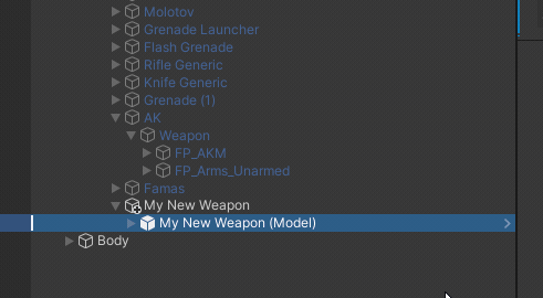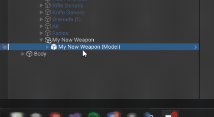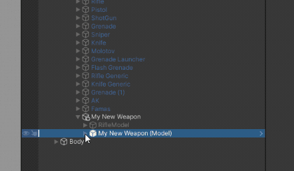Delete the old weapon model of your duplicate weapon to leave just your new weapon model in the hierarchy.