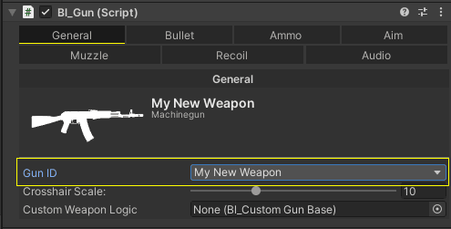 With the duplicate weapon selected in the hierarchy window, navigate to the inspector window > bl_Gun > General > assign the Gun ID of this weapon which is the name of the weapon you define in the GameData All Weapon list early.