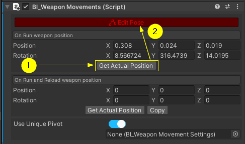 Once you have the running pose, navigate to the inspector window of bl_WeaponMovement again > click in the first 'Get Actual Position' button > then click in the red 'Edit Pose' button again.