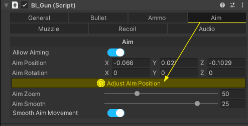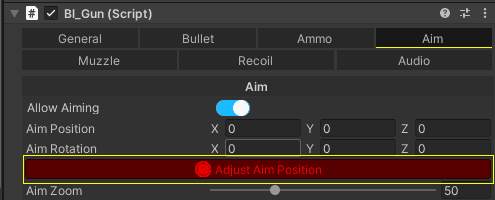Let's start with the weapon Aim Position, which is of course the position of the weapon when the player aims, to set this up, go to the Aim tab in the inspector of bl_Gun > make sure Allow Aiming is on > and click in the yellow button 'Adjust Aim Position'.