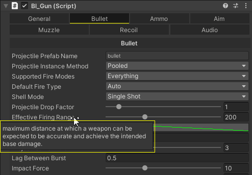 Now tweak the rest of the weapon properties in the inspector of bl_Gun, switch to the different tabs to setup the ammunition, bullet, sounds, recoil, etc... almost all the properties field in the inspector have an tooltip explanation, hover your mouse over a field name that you are not sure what is for and you will see it's description in a tooltip.