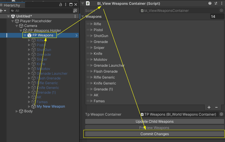 Now the FP Weapon setup is ready, all you have to do now and save the changes to the weapon container prefab, for this simply select the FP Weapons object in the hierarchy window > bl_ViewWeaponsContainer inspector > click on the Commit Changes button > and click yes in the display dialog