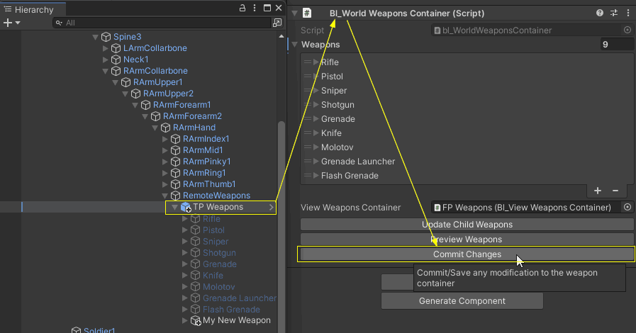 Finally, save the changes to the weapon container, for this, select the TP Weapon object in the hierarchy window > go to the inspector window of bl_WorldWeaponsContainer > click in the Commit Changes button > click yes in the dialog