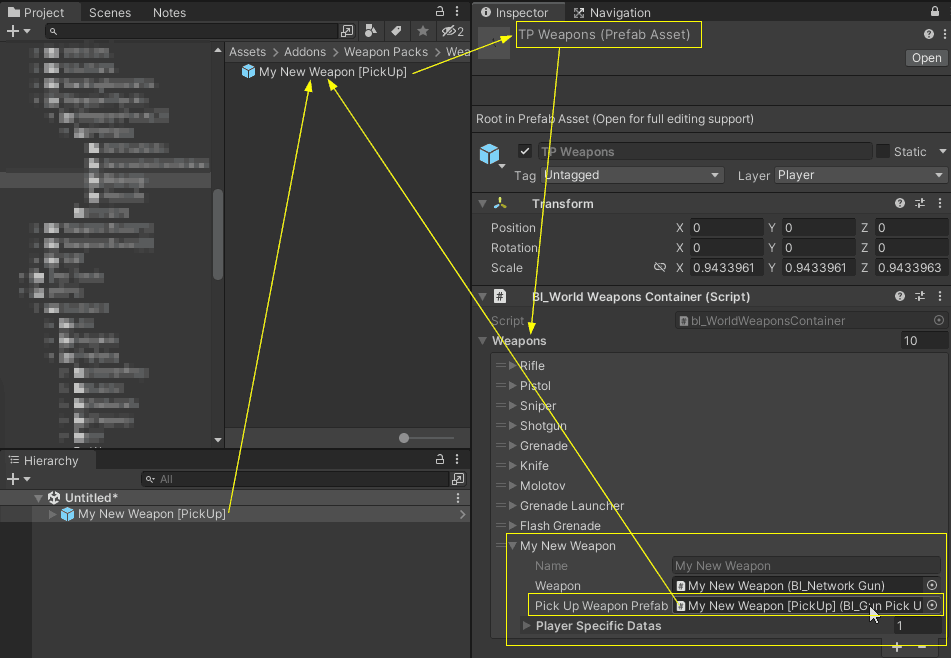 2. Unfold the TP Weapons object in the hierarchy > select your new weapon > active it if it is disabled so you can see it > fine tune the position and rotation of the weapon to simulate the player is holding it just as you did in the original integration.