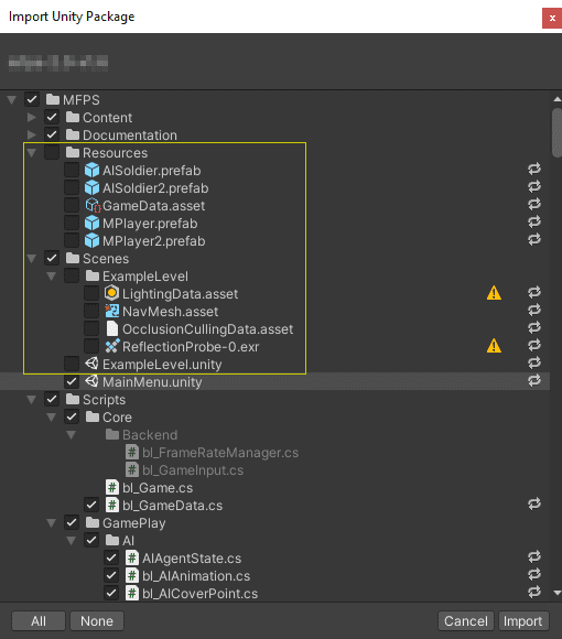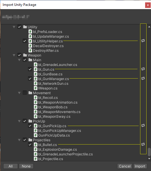• Then, you will simulate import the new MFPS version package in your started project (the project with the old version of MFPS that you have modified), note that I said simulate because you won't import it, you only need that the Unity Package Import Windows show up so you can check the changed files, this window shows all the assets that the package contains and will be imported but also if one of the files already exist in the project, it shows if the file from the package is different with respect at the file in the project, you can differentiate hthose modify files with a "Refresh" icon at the right side of the file name: