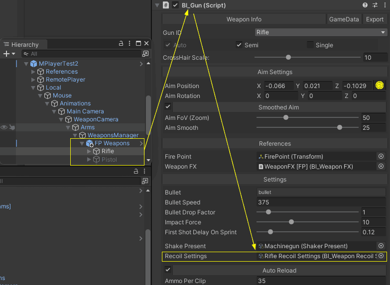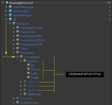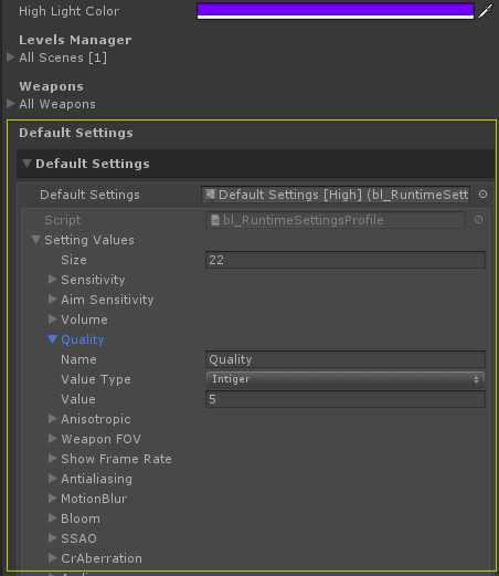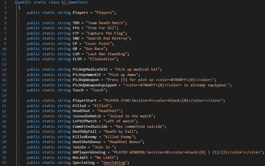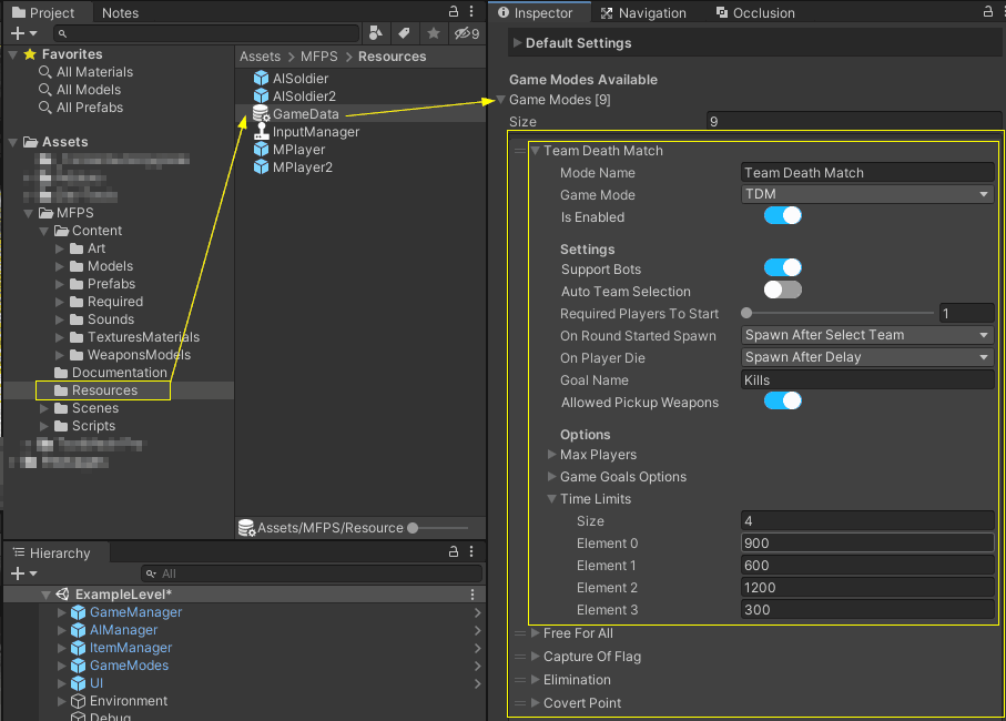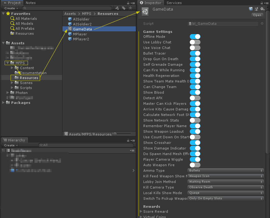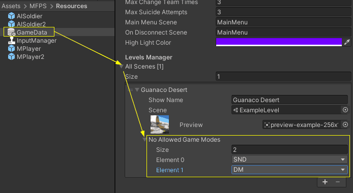 GameData is a ScriptableObject that contain a lot of front-end settings that you can easily tweak to fit your needs and reskin the game, the options go from simple toggles to show or hide blood in the game up to the Weapon and Game Mode information.