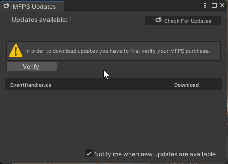 To access the Patch Updater, go to the editor’s top navigation menu, select MFPS > Updates. In the window that appears, you’ll find a list of available patch updates. Before you can download and apply these patches, you must verify your MFPS purchase. This is a one-time process achieved by clicking the Verify button in the same window.
