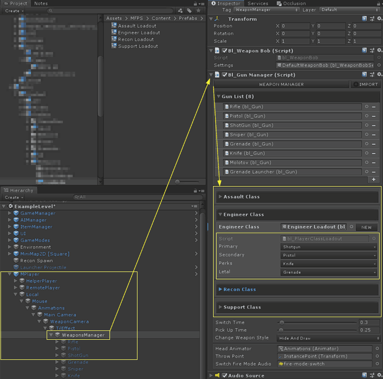 Normally you will use the same hand model for all of your weapons model, using a different material and textures for each team, so you may encounter with the inconvenient of change the hand texture for each weapon in the player prefabs is a little bit annoying, well MFPS handle this.
